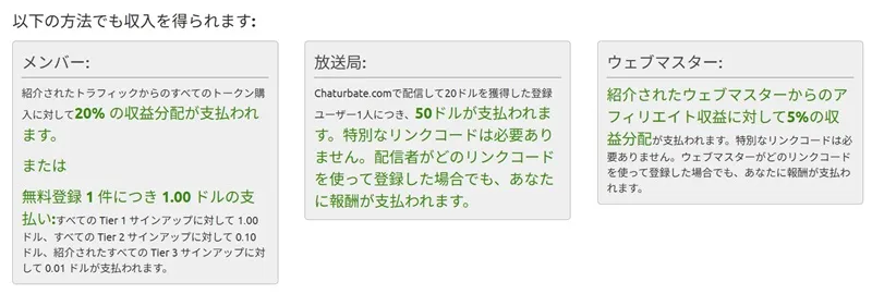 Chaturbate公式ページ下部にあるアフィリエイト紹介プログラムでは、Chaturbate新規ユーザーを紹介するだけで、永続的に売り上げの20%をライフタイム制報酬として受け取ることができます!(Chaturbate公式アフィリエイトプログラムの稼ぎ方をお伝えします。)