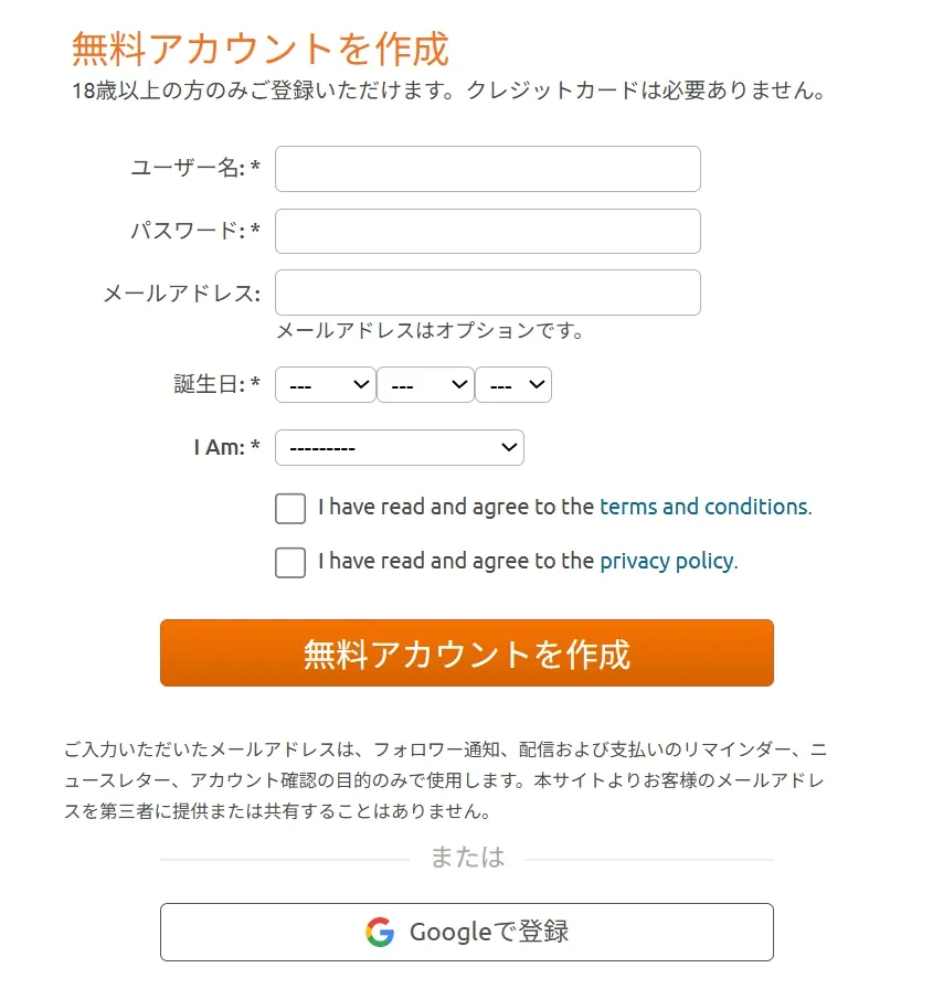 Chaturbateの無料アカウントを作成して、無料のChaturbateアフィリエイターとして活動を開始できます。(永続20%のライフタイム制報酬をゲット! “Eメールアドレス” または “Googleアカウント” でスムーズに無料アカウント登録できます。)
