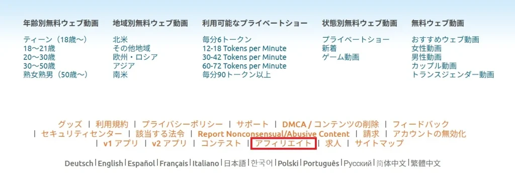 少しわかりにくいですが、Chaturbate公式ページ のスクロールして一番下にある「アフィリエイト」というタブをタップすると、Chaturbateのアフィリエイト専用ページにアクセスすることができます。(日本語表記に100%対応しています。)