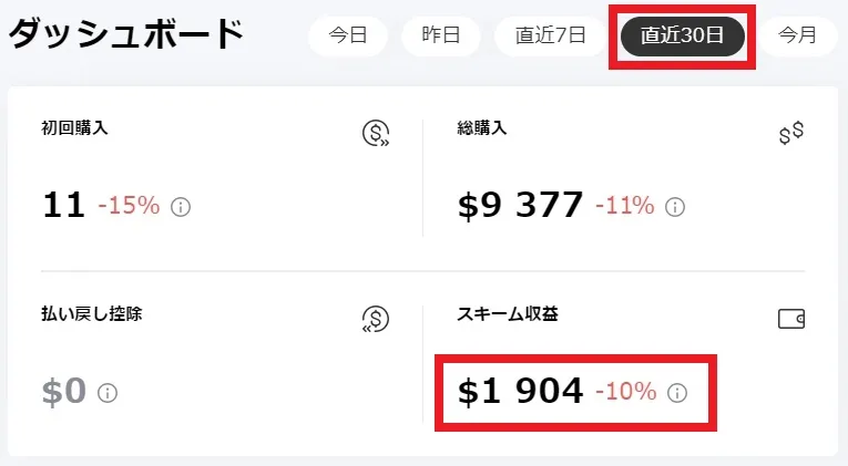 過去30日で$1900ドル=約¥30万円を稼いでいる