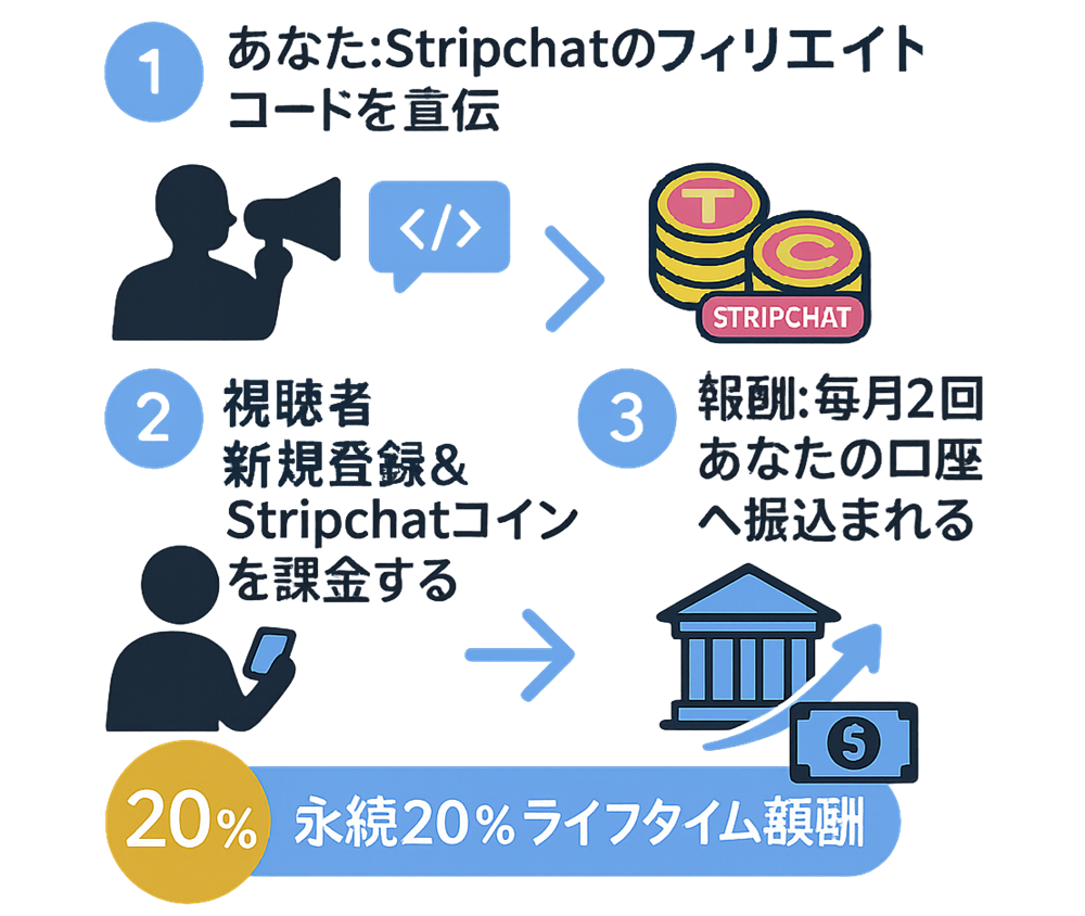 - ③WEBサイトにStripchatのリンクURLを貼り付け、新規登録を獲得するだけ
